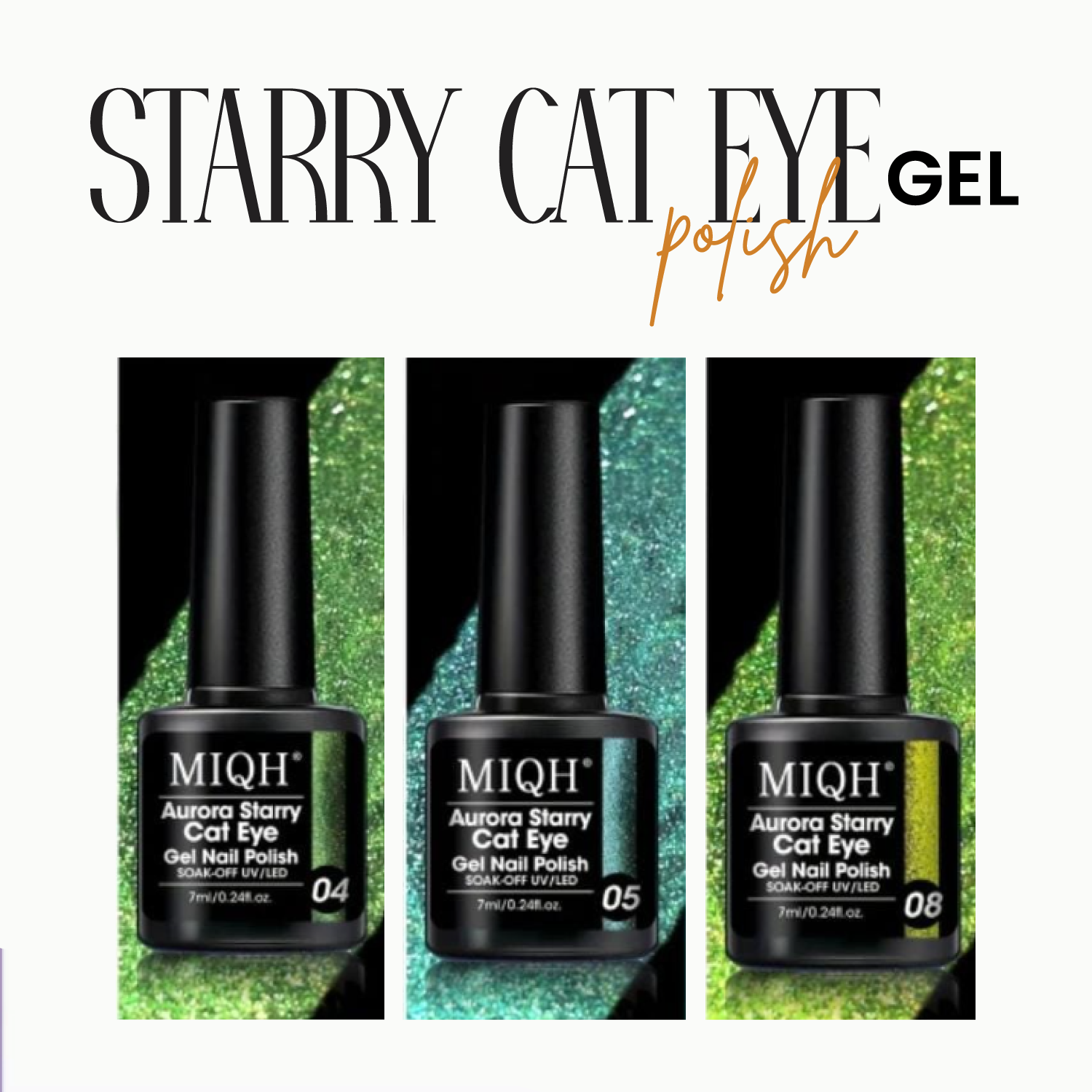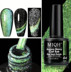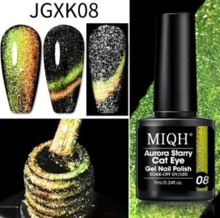 Transform your nails into a celestial masterpiece with the enchanting MIQH Aurora Starry Cat Eye Gel Polish Collection. This mesmerizing line of soak-off gels combines the hypnotic allure of a classic cat-eye stripe with the sparkling brilliance of fine holographic glitter — creating a “starry night” effect that shimmers, shifts, and shines under every light. Each shade in this collection (#04 Green, #05 Teal, #08 Yellow-Gold) features a rich, creamy base infused with ultra-fine glitter particles that catch the light like distant stars. When paired with a magnet tool (sold separately), the magnetic pigment reveals a luminous, glowing cat-eye stripe that follows the curve of your nail — adding depth, drama, and dimension to every manicure. Formulated for both professionals and DIY enthusiasts, these UV/LED-curable gels apply smoothly, self-level effortlessly, and cure in just 60–90 seconds. The result? A long-lasting, chip-resistant finish that lasts up to 3+ weeks — and removes easily with acetone, leaving nails healthy and undamaged. The sleek black bottles feature precision brushes for flawless application, while the 7ml size offers generous use for salon clients or personal collections. Perfect for parties, weddings, holidays, or everyday glam — these Starry Cat Eye gels let you wear the galaxy on your fingertips.